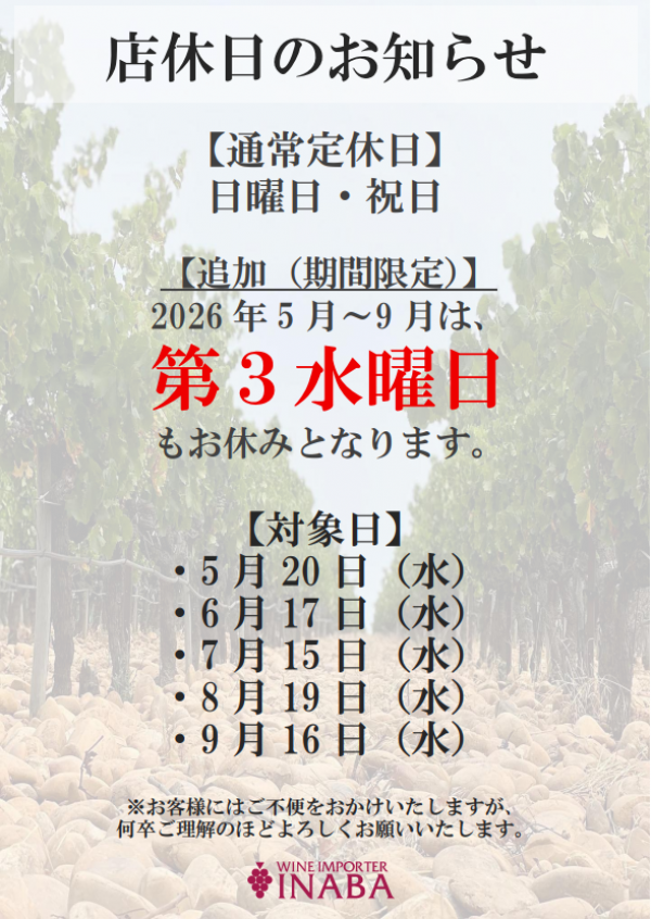 定休日変更のお知らせ(2026年5月より)